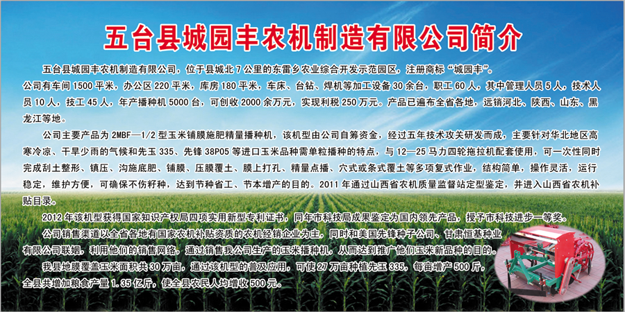 “城園豐”牌2MBF-1/2型玉米鋪膜施肥精量播種機(jī),是由我們五臺(tái)縣城園豐農(nóng)機(jī)制造有限公司歷經(jīng)五年自主研發(fā)、改進(jìn)、定型,于2012年正式投入批量、生產(chǎn)的、能夠?qū)崿F(xiàn)多項(xiàng)作業(yè)一次完成的、經(jīng)推廣應(yīng)用表現(xiàn)良好而深受農(nóng)民朋友歡迎的一種新型機(jī)械及科技產(chǎn)品。它不僅填補(bǔ)了我市農(nóng)機(jī)制造業(yè)上的一項(xiàng)空白,而且在我國(guó)同類(lèi)產(chǎn)品中也處于領(lǐng)先水平。